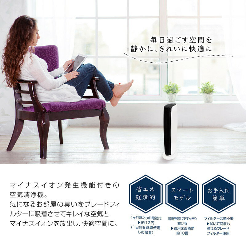 ◆ブレードフィルター使用でフィルター交換不要◆マイナスイオン発生機能付き◆静かにお部屋の空気をきれいにする静穏設計◆触れるだけでモード切替可能なタッチスイッチ式◆1ヶ月あたりの電気代が約13円!◆スリムモデルながら適用床面積は約10畳!◆アロマパットとコットン付属で好きな香りを楽しめます♪